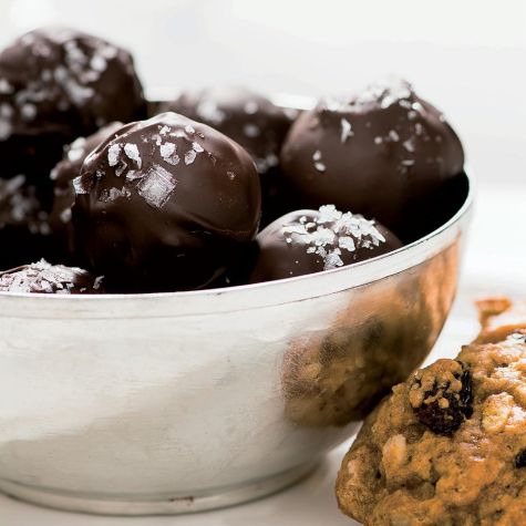 Using a fork, dip the fig balls in the melted chocolate to coat evenly, allowing any excess chocolate to drip back into the bowl. Return the fig bites to the baking sheet and sprinkle with the salt. Refrigerate until the chocolate has set, about 30 minutes. Store covered in the refrigerator for up to 1 week. Makes 34 bites.