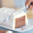 To serve, invert a serving plate on top of the pan and invert the plate and pan together. Holding the ends of the parchment liner firmly on the plate, lift off the pan. Frost the top and sides of the cake with the whipped cream, cut into slices and serve. Serves 10.