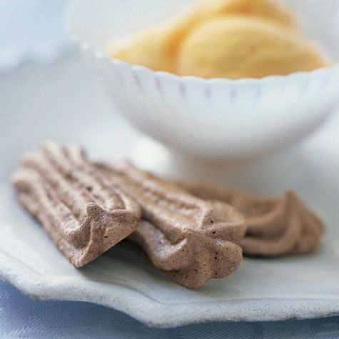 Featherlight meringue produces deliciously elegant, fat-free cookies. Making meringue, however, can be intimidating to many cooks. This one is very forgiving. The cocoa, which delivers a rich flavor, also eliminates concern that your meringue may turn beige during baking. These meringues are even delicious when the centers are still slightly chewy, which may happen if you bake on a humid day. If you do not want to pipe this thick meringue into shapes, omit the pastry bag and spoon dollops of the stiff batter onto baking sheets, shaping them into plump kisses.