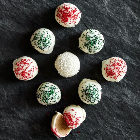 Baker, blogger and award-winning cookbook author Jocelyn Delk Adams loves her eggnog, and even more so when it’s transformed into sweet treats for the holidays, such as these truffles. Dipped into melted chocolate and finished with a flourish of sprinkles, these super-easy truffles are great for holiday presents—and for snacking on while you wrap gifts. Although white chocolate shows off the Christmas-colored sprinkles to best effect, we also like to make these with dark chocolate, whose slightly bitter flavor contrasts with the sweet filling.