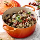 In the late 1970s Chuck Williams started visiting Portugal, where he visited a restaurant north of Lisbon that specialized in seafood dishes from the province of Algarve in southern Portugal. The waiter brought to the table a cataplana, a hinged copper cooking vessel shaped like a clamshell. Later Williams discovered this easy way to cook clams in a cataplana, but a heavy saucepan or Dutch oven works just as well. Find this and many of Chuck Williams' other favorite recipes in our limited edition version of Cooking at Home, which celebrates his 100th birthday.