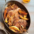 Although Fuji apples are a good choice here, you can use any crisp, slightly tart apple that’s available at the market. Braising the spice-coated pork chops in cider enhances the autumnal flavor.