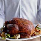 Sam Beall, proprietor of Blackberry Farm, likes to inject his turkey with a mixture of chicken fat and sorghum syrup before roasting, a technique that produces incredibly juicy meat. For a similar effect, the chefs at the farm created this apple cider brine with lots of herbs and spices. They use sorghum syrup, a locally produced sweetener available at Muddy Pond Sorghum Mill, to sweeten the brine, but maple syrup works equally well. Roasting garlic and shallots along with the turkey enhances the bird’s aroma while cooking and provides easy, attractive garnishes for the serving platter.