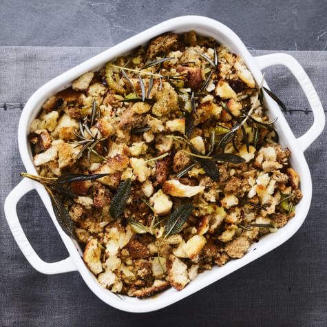 For every person who loves their stuffing chock full of ingredients like sausage, kale, apples, chestnuts or even oysters, there’s another one who prefers a simple stuffing flavored with fresh herbs, the better to let the Thanksgiving turkey and gravy shine. This is one of our favorite ways to prepare stuffing in its elemental form.