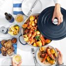Featuring tender shrimp, corn, potatoes and sausage in a spicy, beer-based broth, a seafood boil is the perfect one-pot meal for summer dinner parties. Our Test Kitchen chefs made a few upgrades to chef Vivian Howard’s recipe for a traditional Low Country-style shrimp boil by adding a mix of red and Yukon gold for color, chopped parsley for a burst of freshness, and grilled sourdough bread for soaking up all that delicious broth. This dish lends itself well to variations: You can use any sausage that you like, or swap the shrimp for mussels, clams, crawfish or a mix of your favorite shellfish. If using clams or mussels, check to make sure that the shells are completely open before serving.