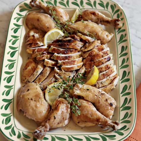 Using a mallet or a meat tenderizer, tap on the clay to break through the baked shells. Carefully remove large pieces of hot clay and brush away any small pieces. Discard the clay. Open the parchment and, using tongs, gently transfer the chickens to a cutting board. Insert an instant-read thermometer into the thickest part of the breast and thigh, away from the bone; the breast should register 160°F and the thigh, 170°F. If the chickens are not yet done, place them in a clean roasting pan or on a baking sheet and continue roasting until the correct internal temperature is reached. Carve the chickens into serving pieces and serve immediately. Serves 6 to 8.
