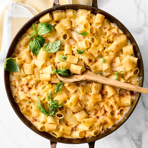 Think you can’t improve on classic mac and cheese? Our Test Kitchen chefs have done just that by adding fresh corn kernels to the mix, transforming it into a summery side dish that both kids and adults will love. The corn lends sweet crunch, while three kinds of cheese bring the creamy, gooey richness that’s the hallmark of this comforting dish. The chefs prepare the mac and cheese in a cast-iron skillet, then slip it under the broiler just before serving to produce an appealing crispy crust on top.