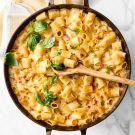 Transfer the skillet to the broiler and broil until the cheese is golden and bubbling, 3 to 5 minutes. Garnish the mac and cheese with basil and serve immediately. Serves 8.
