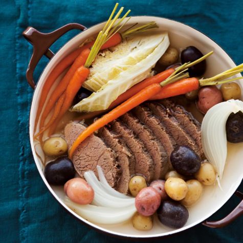 If you like, plan ahead and corn your own brisket: In a bowl, combine 8 cups water, 1 1/2 cups kosher salt, 1/2 cup sugar, 3 Tbs. pickling spices and 3 garlic cloves, crushed. Stir until the salt and sugar are dissolved. Submerge one 4-lb. brisket in the mixture, cover and refrigerate for 5 to 8 days. Remove the brisket, rinse well under cold water and then proceed with the recipe.