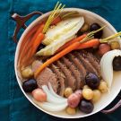 Using a slotted spoon, transfer the vegetables to a large platter. Transfer the brisket to a cutting board. Cut the meat across the grain and arrange on the platter with the vegetables. Serve immediately and pass the horseradish cream on the side. Serves 6 to 8.