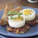 Transfer 2 patties to each individual plate. Top each patty with a poached egg. Serve immediately. Serves 8.
