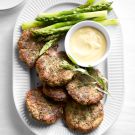 Scoop and roll the crab mixture into 6 even balls. Flatten the balls into patties and refrigerate for at least 1 hour. Meanwhile, bring a pot of salted water to a boil. Blanch the asparagus until tender, 2 to 3 minutes. If not serving right away, shock the asparagus in ice water for about 2 minutes. Drain and set aside until ready to reheat and serve.