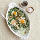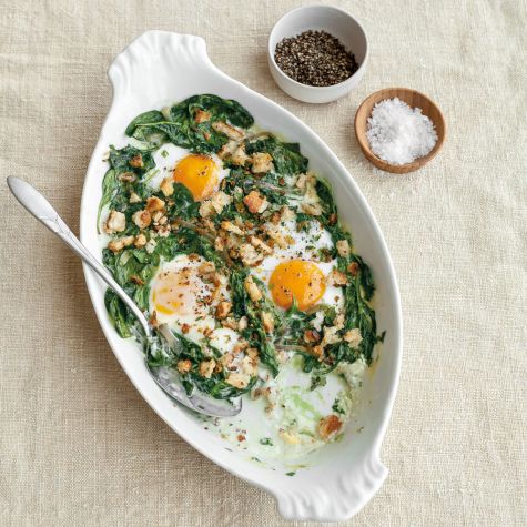 This eggs-for-dinner recipe requires very few ingredients, so buy the best farm-fresh eggs and baby spinach you can find. You’re also looking for irregular bits of freshly ground bread crumbs to add texture here, so use homemade bread crumbs instead of purchased. Other than that, this recipe is very adaptable. You can substitute sautéed mushrooms, zucchini or tomatoes for the spinach; in fact, just about any tender vegetable will taste great. Serve with warm sourdough bread and crisp, dry white wine like a Spanish Albariño.