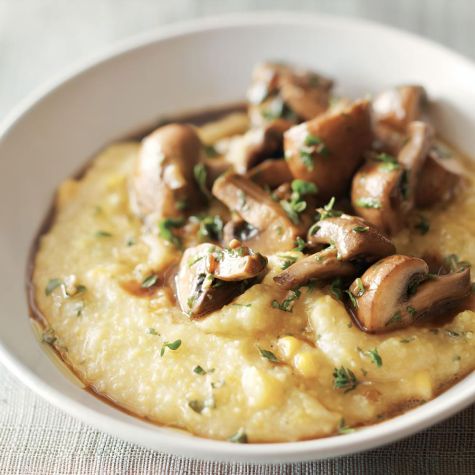 A topping of garlicky, earthy mushrooms adds both texture and sharp flavor to creamy, soft polenta laced with sweet corn kernels. Because polenta cooks unattended in a slow cooker—there’s no need for the typical constant stirring—you can serve it alongside a main course that requires last-minute attention, such as grilled or panfried veal or lamb chops. Or, for a vegetarian main course, substitute the chicken stock with vegetable stock and serve the polenta with a green vegetable.