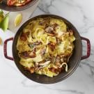 When the weather turns cold, this comforting pasta dish will hit the spot. It was created by Tieghan Gerard, cookbook author and founder of the blog Half Baked Harvest. She tosses wide pappardelle noodles with herby pan-fried mushrooms and a creamy sauce enriched with two kinds of cheese, plus a pinch of red pepper flakes for a kick of heat. “Every twirl of pasta is creamy, silky and laced with rich, warming fall flavors,” she says. Use a mix of your favorite mushrooms, both wild and cultivated. Then pair the pasta with Tieghan’s chicken piccata for a satisfying supper.