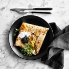 Simple yet elegant, crepes with caviar and crème fraiche are the ultimate dish for a holiday brunch. We also add thinly sliced fried potatoes to make this heartier. Keep in mind that the batter needs to be refrigerated for at least 1 hour or up to 24 hours before you cook the crepes. This gives the dry ingredients time to absorb the liquid, which will thicken the batter and produce crepes with a finer, more delicate texture. Bonus: You’ll get a jump-start on the prep.