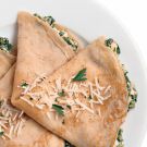 To make the filling, in a bowl, combine the creamed spinach, eggs, 1/2 cup of the cheese, salt, pepper and nutmeg. To assemble, lay a crepe flat, spread 1/4 cup of the filling over the crepe and fold into quarters. Transfer to the prepared baking sheet. Repeat with the remaining crepes and filling. Sprinkle the crepes with the remaining 1/2 cup cheese. Bake until the crepes are warmed through and the cheese is golden, about 15 minutes. Serve immediately.