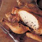 Distinctively earthy and intensely fragrant black truffles season this golden-brown roasted chicken. Truffle butter rubbed under the skin infuses the meat with flavor, and more butter whisked into a pan sauce made with the drippings gives the sauce a luscious, velvety feel and indulgent taste.