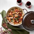 When the weather turns cold, dig into this comforting meal of juicy chicken thighs, earthy mushrooms and an herb-infused cream sauce enriched with chicken demi-glace. We call for a cast-iron pot because it heats evenly and retains heat well, producing wonderfully crisp skin on the chicken. Use whatever combination of wild and cultivated mushrooms you’d like for this recipe. If the mushrooms are less than 2 inches (5 cm) wide, you can leave some whole, rather than slice them. Serve this hearty dish with mashed potatoes or crusty bread to soak up the luscious sauce.