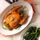 Carve the chicken at the table and serve with the meat juices. Serves 4.