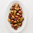 Simple roasted potatoes seasoned with your favorite herbs are the classic accompaniment to both roasted and braised meats and poultry. Although thyme, rosemary and sage are the herbs you’re most likely to see tossed with potatoes, here the use of fresh mint and a bit of grated lemon zest puts a new spin on the classic.