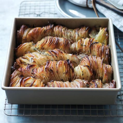 Roast until the top edges of the potatoes are crispy, about 1 hour. Let stand for 10 minutes before serving. Serves 6 to 8.