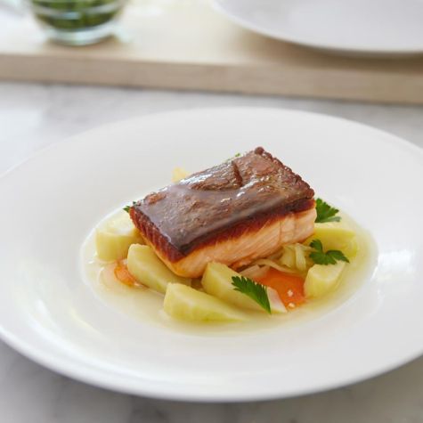 Transfer the salmon to a serving dish or individual plates and sprinkle the skin with the finishing salt. Serve immediately. Serves 2.