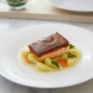 To cook the salmon, season the flesh side only with kosher salt. Heat a 10-inch (25-cm) fry pan over medium-high heat. Add enough canola oil to cover the bottom of the pan by about 1/8 inch (3 mm). When the oil begins to shimmer and release wisps of white smoke, carefully lay the salmon skin side down in the hot oil and turn the heat down slightly. Very gently shake the pan or use a thin spatula to scoot the fish a little bit to ensure that the skin is not sticking to the bottom of the pan. Reduce the heat again to medium and cook until the bottom third of the salmon’s flesh has been cooked through as indicated by its opaque appearance, about 3 minutes. Use a thin metal spatula to tilt the fish and check to see if the skin is golden brown and crispy. If it needs more crispness, increase the heat for a few seconds and check again. Remove the salmon from the pan and set skin side up on a plate. Pour off the excess fat from the pan and return to medium-low heat. Add the butter to the pan. When it is completely melted and has begun to foam, place the salmon in the butter flesh side down. Turn off the heat and let the salmon sit in the butter for about 1 1/2 minutes, then remove the salmon from the pan to a paper towel–lined dish to remove any excess butter.