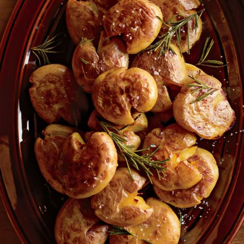 A two-step cooking process yields potatoes that are tender on the inside and crispy on the outside. First, simmer them in salted water. Let cool, then smash the potatoes and fry in a griddle pan until browned. Garnish with a handful of chopped fresh herbs.