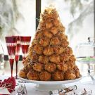 Popular in France for weddings and other festive occasions, a croquembouche—a dramatic tower of cream puffs that are stuffed with pastry cream, held together with caramel and wrapped in spun sugar—also makes a showstopping centerpiece for your holiday table. And, although the recipe may seem complex, the cream puffs can be made up to a few weeks in advance and stored in the freezer, and the pastry cream can be made up to 3 days in advance. However, you should assemble the dessert no more than 2 hours before serving it, as the pastry cream will eventually turn the cream puffs soggy.