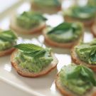 Spread the puree on the baguette slices and arrange on a platter. Garnish the crostini with the mint sprigs and then drizzle them with olive oil. Serve immediately. Serves 10 to 12.