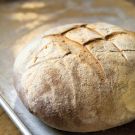 Bake for 15 minutes, using a mister to quickly spray the side walls of the oven with water every 5 minutes. Reduce the oven temperature to 375°F, rotate the baking sheet front to back and continue to bake until an instant-read thermometer inserted into the center of the loaf registers 210°F. Let cool 5 minutes, then transfer to a rack and let cool slightly before slicing. Makes 1 large loaf.