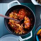 A classic Cuban-style blend of citrus, sweet peppers, tomatoes and herbs, our chicken fricassee braising sauce turns economical chicken thighs into a company-worthy meal with a minimum of fuss. Serve on top of steamed rice to soak up the delicious braising sauce.