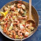 Return the paella to the oven and bake until all the liquid has been absorbed, about 5 minutes. Remove from the oven and cover with a clean kitchen towel. Let stand at room temperature for at least 10 minutes or up to 30 minutes before serving. Serve with the lemon wedges. Serves 4 to 6.
