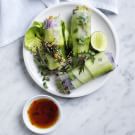 Place one of the cucumber ribbons on your cutting board, with a short end facing you. Place one of the spring rolls crosswise on top of the cucumber at the end closest to you. Roll the spring roll and cucumber together so that cucumber ribbon covers most of the rice paper. Place the spring roll back on the platter, seam side side. Repeat with the remaining spring rolls and cucumber ribbons.