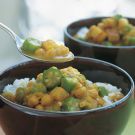 Return the pan to medium-high heat and add the remaining 1 Tbs. oil. Add the onion-garlic paste and fry until fragrant, about 2 minutes. Stir in the curry mixture and the broth, mix well and bring to a boil. Add the sautéed vegetables and the chickpeas. Reduce the heat to low and cook, uncovered, until the potatoes are tender, 15 to 20 minutes. Taste and adjust the seasoning with salt. Serve with steamed rice. Serves 4.