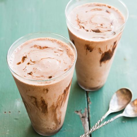 These rich milkshakes will get rave reviews for both their thickness and their flavor. The bananas help to thicken the shakes, and a drizzle of chocolate syrup gives them a deep, dark chocolate flavor.