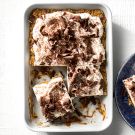 Spread the whipped cream evenly on top of the graham cracker crumble. Grate the dark chocolate over the top of the whipped cream. Refrigerate for 30 minutes and then serve. Serves 6 to 8.