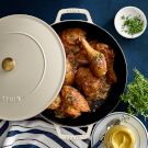 Return all chicken parts, skin side up, to the pan and nestle them in together. Transfer the braiser to the oven and roast the chicken until just cooked through, 15 to 20 minutes. Transfer the chicken to a serving platter and return the braiser to the stove.