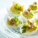 Deviled eggs—an American classic—seem to appear at almost every potluck and brunch. Here, however, the addition of small shards of crispy prosciutto elevates the dish from the everyday and makes this comfort food favorite worthy of a elegant event or a celebratory meal.