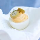 There are countless ways to devil an egg. In this version from Feast Charleston, a South Carolina caterer, the eggs are filled with a pimento cheese mixture, which gets a spicy kick from cayenne pepper and Louisiana hot sauce (Crystal brand is an excellent choice). Feast Charleston uses sea salt from Bulls Bay, a company that sustainably harvests the salt from South Carolina waters. Instead of using pickled okra, you can garnish each egg half with a rosette of very thinly sliced country ham, such as Edwards Surryano, or prosciutto if you prefer.