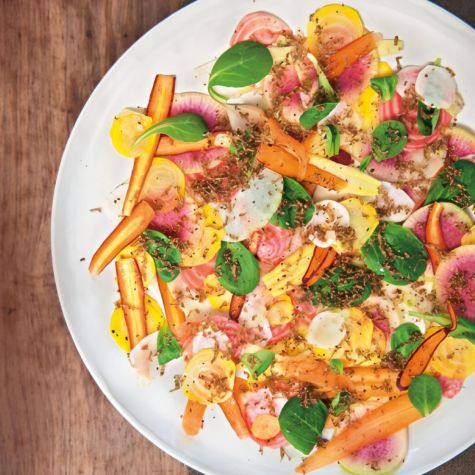 Chris Cosentino, chef at Incanto restaurant, first made this salad many years ago for a demo at the farmers’ market. It was a way to make fun of some of the shoppers who were complaining that the vegetables were dirty when they bought them. What could be better than earthy root vegetables paired with the earthiness of fresh truffle?