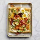 Place the pastry on a serving plate or a nice cutting board. Spread the hummus over the flattened portion of the pastry (leave the puffed border bare). Top the hummus with the vegetables—some will probably get away and tumble over the edges, and that’s fine and pretty—followed by the eggs. Season the eggs with salt and pepper, sprinkle the tart with the remaining herbs and serve immediately.