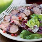 Preheat a cast-iron grill pan on the stovetop over medium-high heat until smoking, 5 to 10 minutes. Working in batches, place the duck breasts, skin side down, in the preheated pan and cook until the fat begins to render, 4 to 5 minutes. Transfer the breasts to a shallow dish; reserve the rendered fat for another use. Pour half the pomegranate glaze over the duck and turn to coat. Keep the remaining glaze warm.