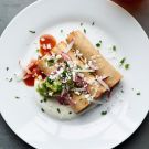 To serve, spoon 2 Tbs. of the crema on an individual plate. Remove one of the skewers holding the taquitos together and arrange the 3 taquitos on top of the crema. Spoon 3 Tbs. of the avocado salsa, 2 Tbs. of the salmorejo salsa and 2 Tbs. of the guacamole on top of the taquitos. Sprinkle with 1 Tbs. of the queso fresco.
