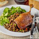 In a large nonstick fry pan over medium-high heat, warm 1 cup of the reserved oil. When the oil is hot, add the duck legs, skin side down, and cook until the skin is browned and crispy, 3 to 5 minutes. Turn the duck legs over and cook until browned on the other side, 2 to 3 minutes. Transfer to the rack-lined baking sheet to drain. Serve the duck legs warm with braised lentils. Serves 8.