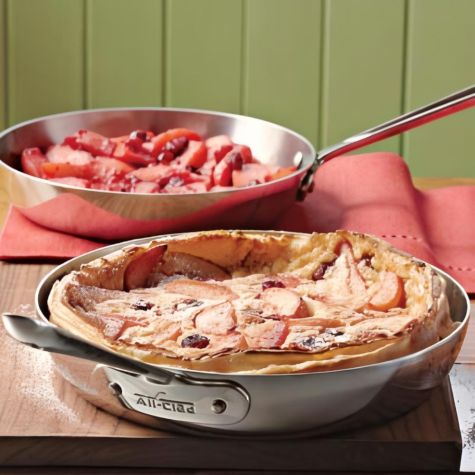 Sometimes known as a German pancake, a Dutch baby is a cross between a soufflé and an omelette. It is oven-baked in a hot fry pan rather than cooked on the stovetop. Here we embellish the Dutch baby with an apple-cranberry compote.