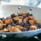 Return the pan to high heat and add the remaining 2 Tbs. corn oil. Add the eggplant and stir-fry until golden brown, about 7 minutes. Add the ginger, garlic and mushrooms and continue to stir-fry until the mushrooms have released much of their liquid, about 3 minutes more. Return the chicken to the pan. Add the sauce to the pan and stir until it thickens slightly, 1 to 2 minutes. Serve immediately with steamed rice. Serves 4.