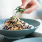 Transfer the eggplant to a cutting board and chop into 1-inch chunks. Spoon the rice into shallow bowls, top with the eggplant and drizzle with the chili sauce. Sprinkle with the basil and serve immediately. Serves 4.