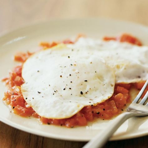 Divide the peperonata among 4 warmed plates, spreading it to make a bed. Top each serving with 2 eggs. Season with salt and pepper and serve immediately. Serves 4.